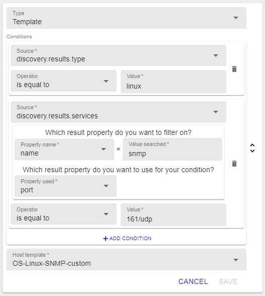 For example, we can condition the application of the OS-Linux-SNMP-Custom template to a Host only if an available SNMP service is also detected: