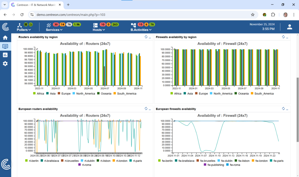 Centreon monitoriza los procesos empresariales de extremo a extremo y mide automáticamente la tasa de disponibilidad de los procesos operacionales para generar informes de SLA (acuerdos de nivel de servicio). Todos sus procesos empresariales críticos dependen de la infraestructura de red para un rendimiento óptimo. Monitorizar solo el rendimiento de la red no es suficiente; realmente necesita una visión global sobre cómo el rendimiento de la red afecta los procesos empresariales.
