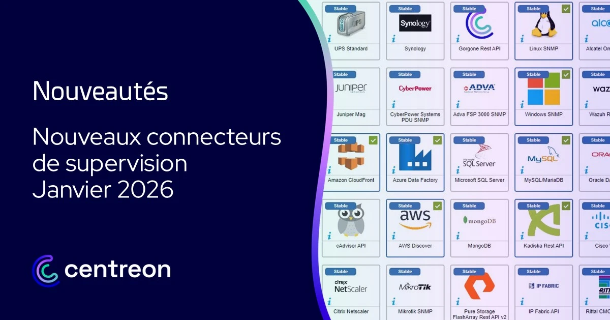 Chaque mois, Centreon élargit son catalogue de connecteurs de supervision pour faire de votre plateforme de supervision un outil toujours plus connecté et innovant au service de vos équipes. Ces nouveautés seront vos alliés au quotidien pour exploiter l’interopérabilité de votre supervision IT avec d’autres outils ITOps, gagner en visibilité et renforcer vos capacités d’observabilité.