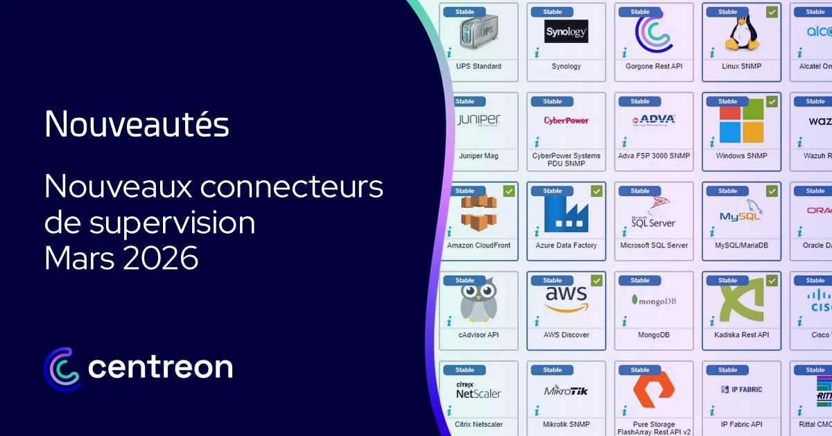 Chaque mois, Centreon élargit son catalogue de connecteurs de supervision pour faire de votre plateforme de supervision un outil toujours plus connecté et innovant au service de vos équipes. Ces nouveautés seront vos alliés au quotidien pour exploiter l’interopérabilité de votre supervision IT avec d’autres outils ITOps, gagner en visibilité et renforcer vos capacités d’observabilité.