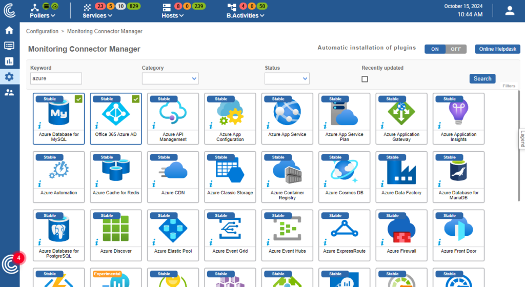 Centreon prend en charge la supervision de plus de 25 services Azure, tels que les machines virtuelles (VMs) Azure, les bases de données SQL Azure, les fonctions Azure, la gestion d’API Azure et le service Kubernetes Azure (AKS). Les connecteurs Azure permettent de capturer et analyser des métriques telles que l’utilisation du CPU, la consommation de mémoire, les comptes de connexion et le trafic réseau.