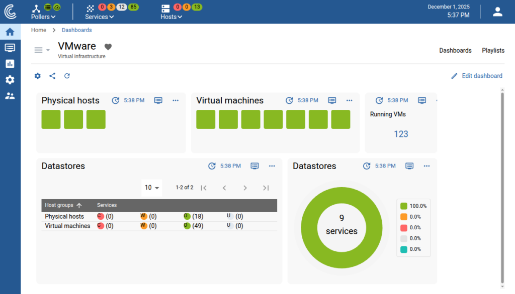 - Les tableaux de bord personnalisables rendent possible d’afficher les métriques clés à travers des tableaux de bord interactifs, des diagrammes et des cartes d’application. Ainsi les équipes peuvent surveiller les performances et la santé de l’infrastructure VMWare.