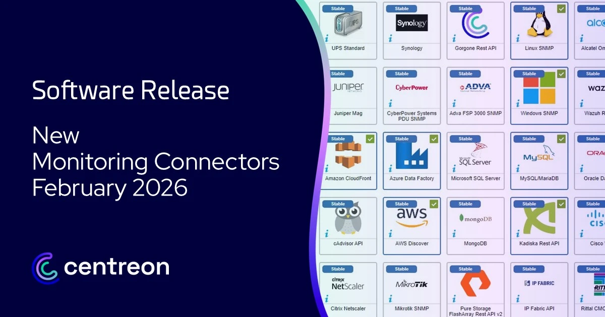 Every month, Centreon extends its monitoring connector catalog and implements new connectors, allowing you to connect your IT monitoring with always more ITOps tools.